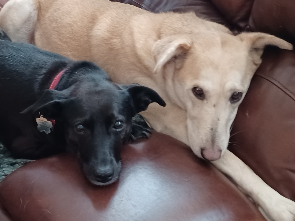 Pearl is our new rescue and is the little (30 lbs.) one shown here. Kona is our blondie pictured here (50lbs.) Funnily enough, Pearl rules the joint. Kona’s inner lab just makes her a bit too melo to argue with Pearl.